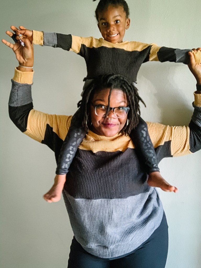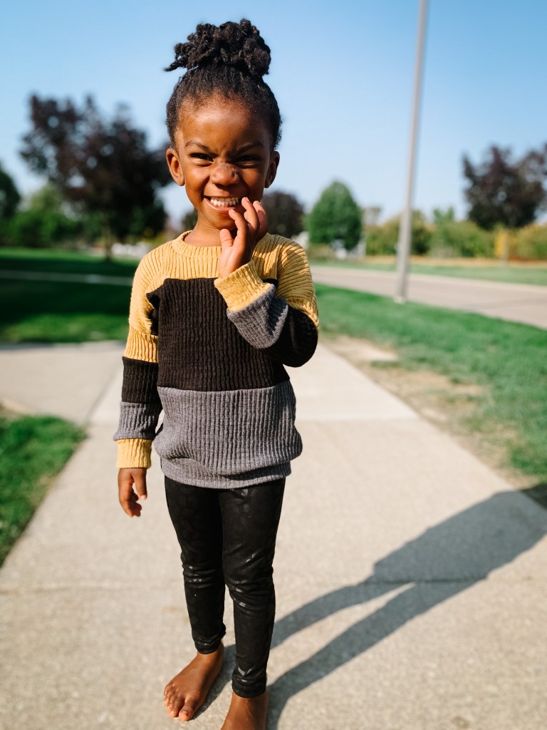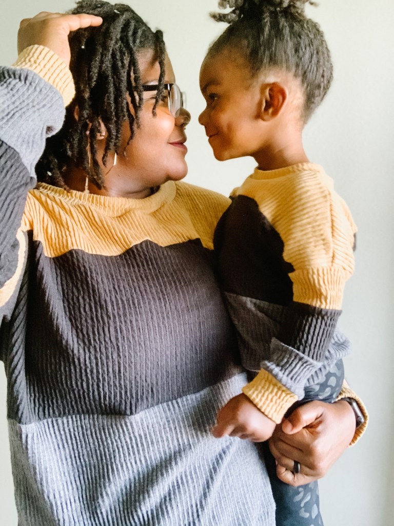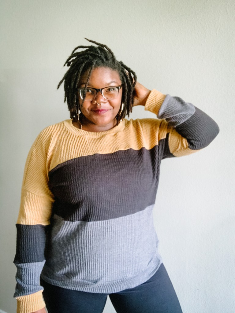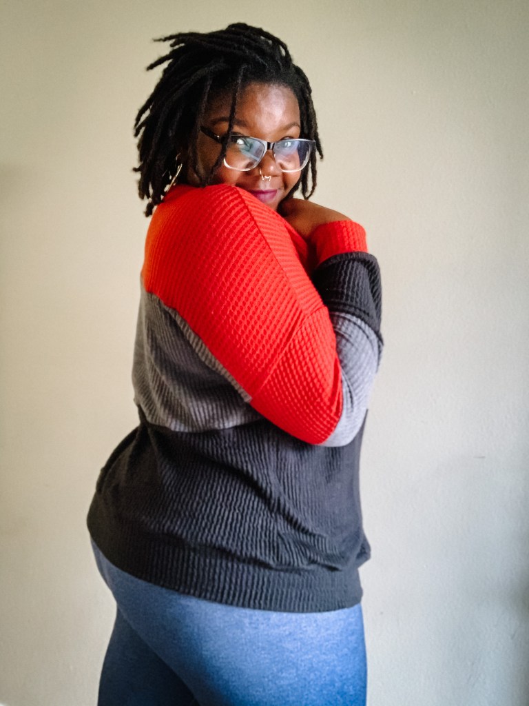 She’s so fun when it comes to taking photos! This pattern was a quick way to build up my sweater stash. I was doing this test while having to deal with some back pain. The plan was to only sew up one for me and one for Amethyst. But I managed to squeeze another one in on the last day because I loved watching this pattern come together. Now I just need to figure out how can a lumpsum of money fall into my wallet magically so I can indulge in a huge order full of sweater knit?! I’ll figure something out a spell to make that happen. But I have many colorblocking ideas! Pan african colors (y’all know me), green shades, shades of black, maybe even blues!