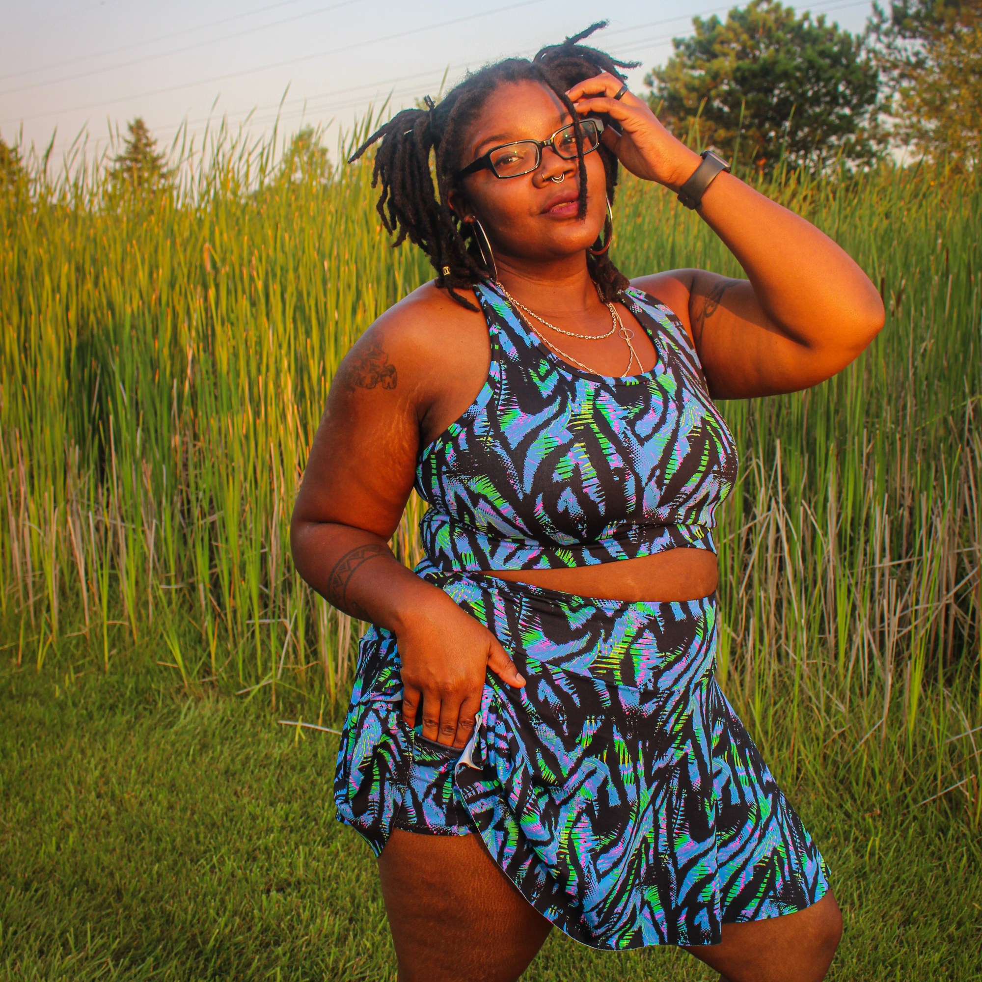 And let me tell y’all these pockets are so awesome! They fit my post-workout bar and phone very securely while I ran on the treadmill at the gym and while using other machines. Due to the fit and look of the shorts, I plan to make this without the skirt. Yes, the shorts are that awesome. Also, as much as I love skorts I stayed away from them and other mini skirts because of my booty. Mini length looks good in front, then the back is hella short and showing undies. I’m thankful that this pattern shows you how to do a booty hack, which is as simple as adding 2-3 inches of length to the back for more coverage on the booty.