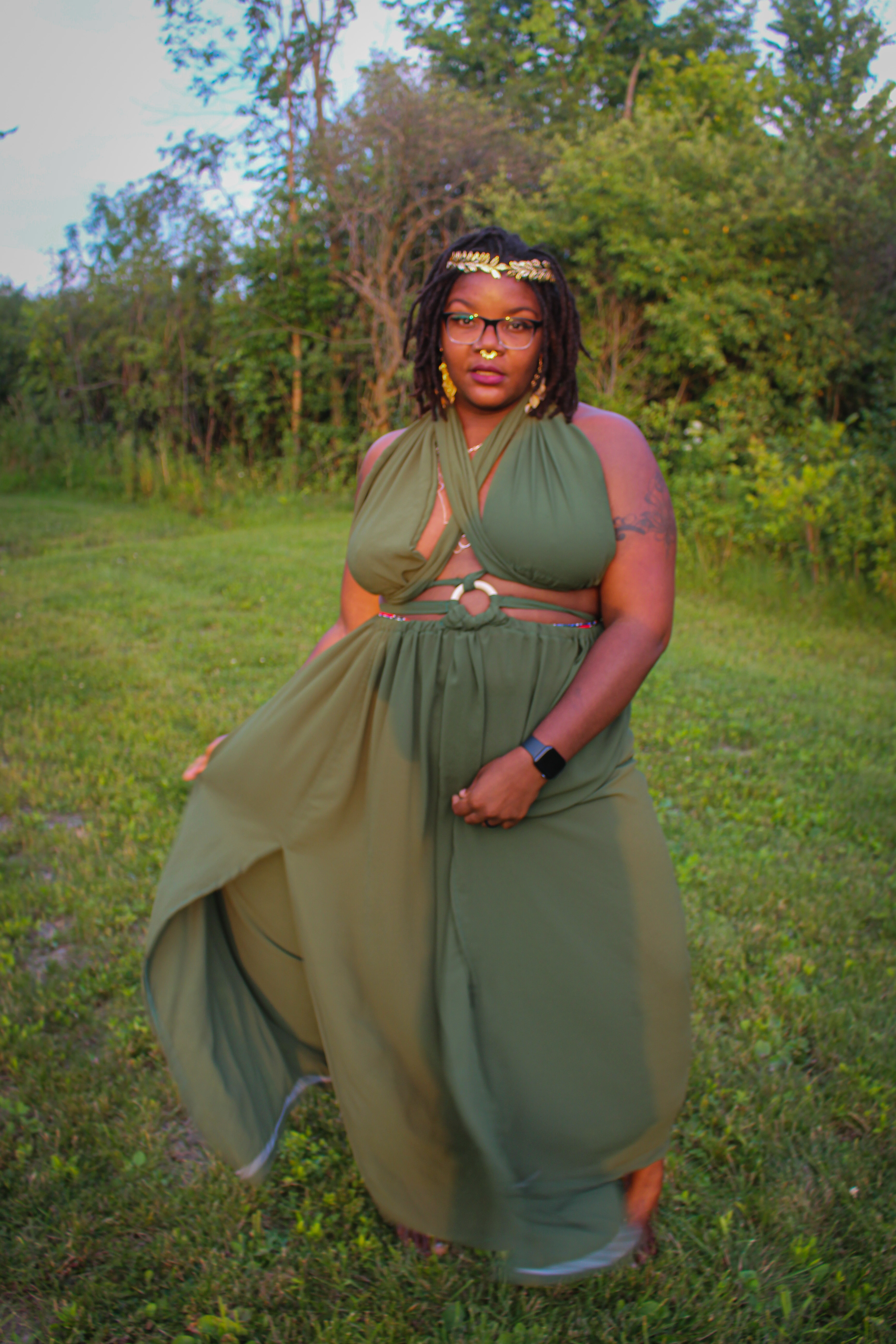 So let’s talk about this fabric! This is Georgette from Surge Fabric Shop (duh). This color (and it being one of the recommended fabrics) is the main reason why I grabbed this fabric but lets be honest; this was no fun to work with for me! This fabric moved a lot and became a pain to work with. Only a couple days before the photos were due for this pattern, Surge restocked on some Crepe De Chine. I used Crepe De Chine for a Tempest Gown a week before needing photos of this Vision Dress. I fell in LOVE with Crepe De Chine. I really wanted to use that fabric for my final version of this dress but I wasn’t able to get in the newly stocked colors in time.