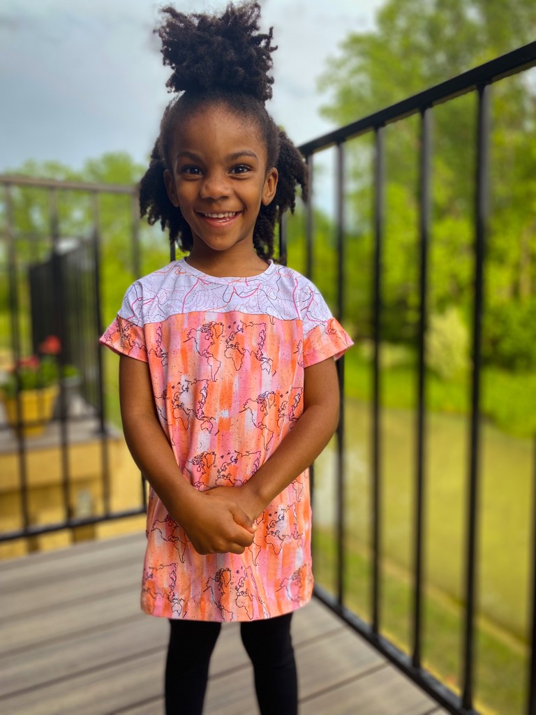 The pink athletic knit is from my staple spot, Surge Fabric Shop. I have grown so fond of nylon spandex. It’s cool to the touch and super stretchy. Baby girl is wearing her Kit Dolman using Rockerbye Destash custom cotton lycra!