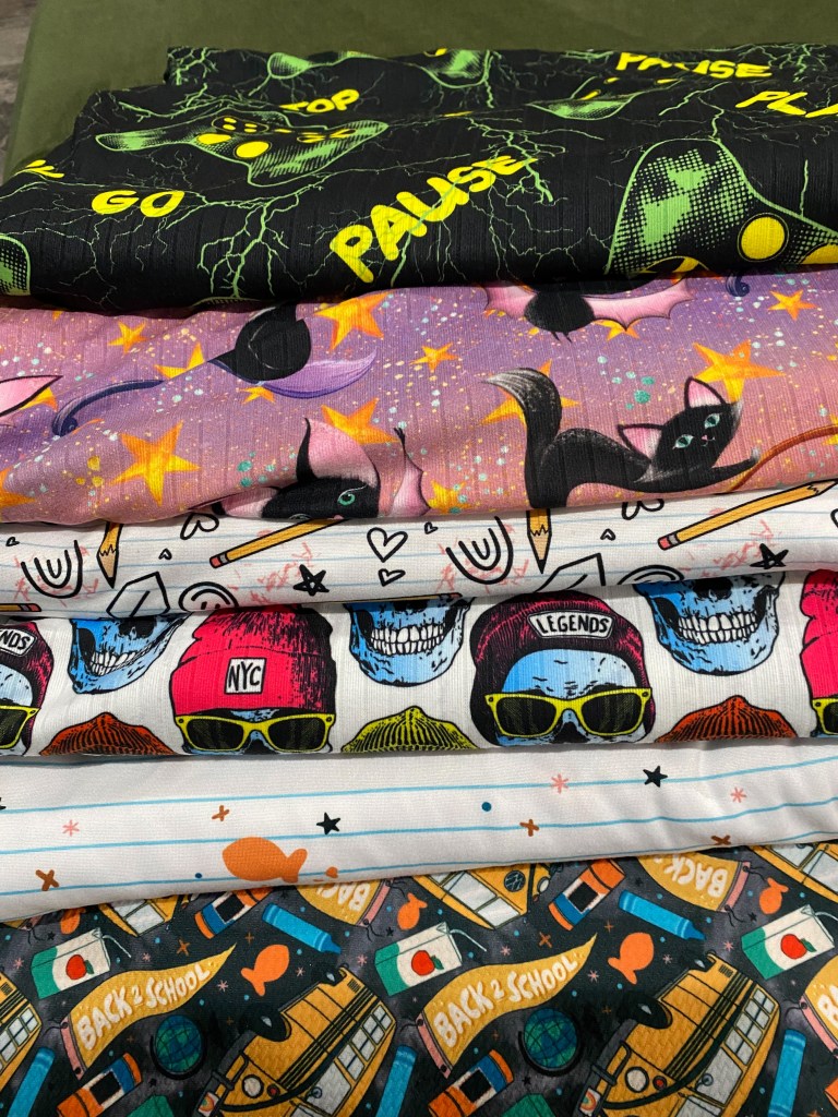 - Rockerbye Fabrics: Amber the owner, ships her retail HELLA FAST yall. It just amazes me. Its almost like she lets the fabric touch her hands and she immediately tosses it in a package like its a game of hot potato. She has such a fun selection of customs with great weight and quality that my kids and I loove! She also has some extra wide solid cotton lycra that is priced well!