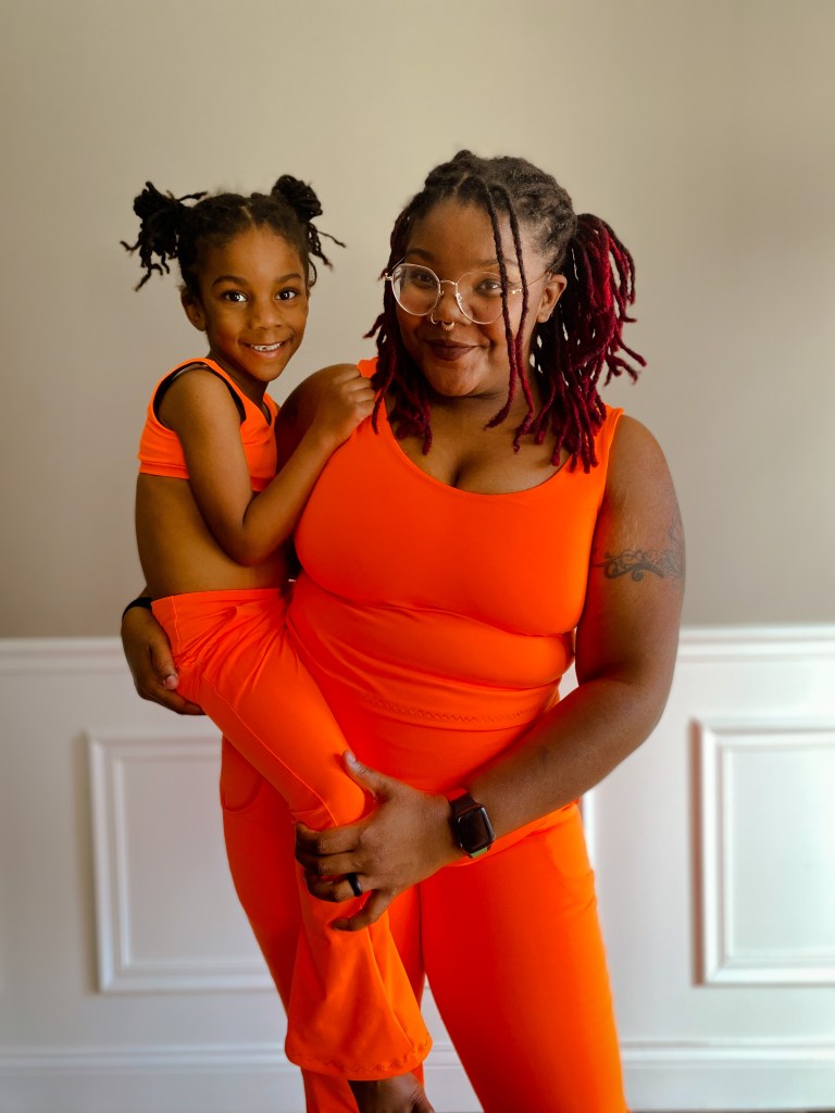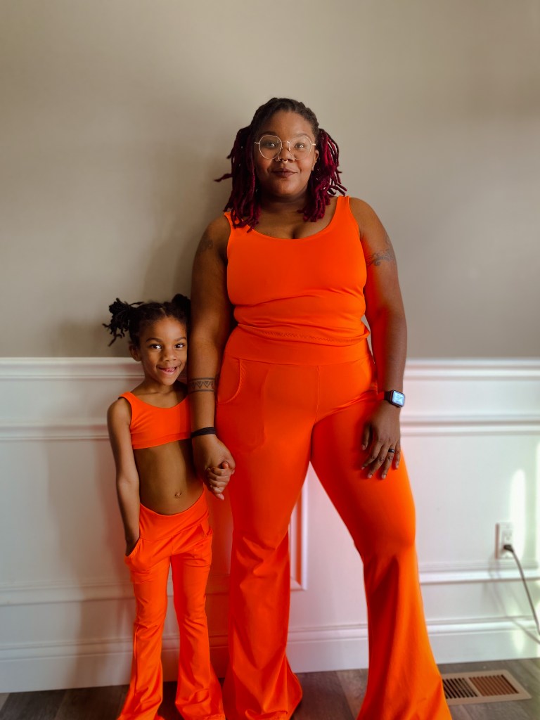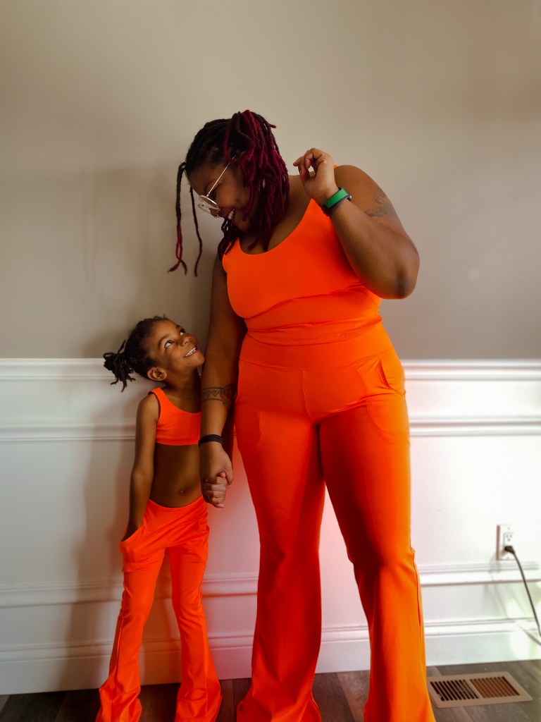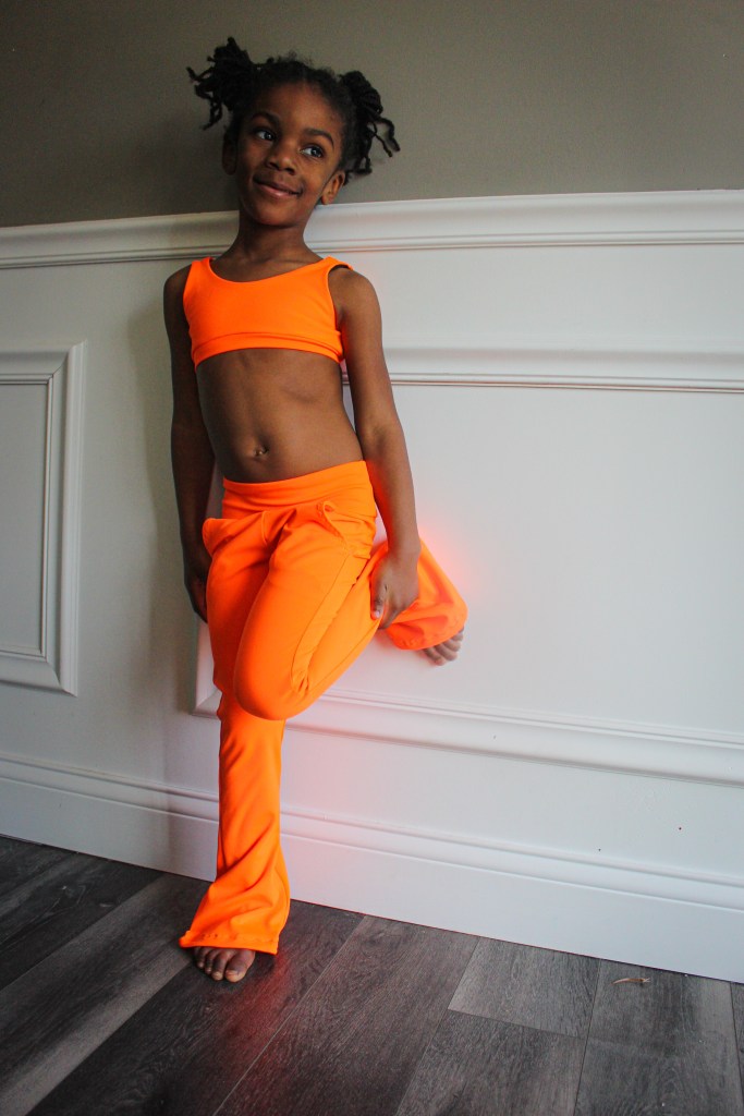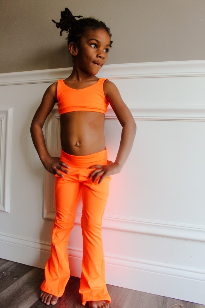 The first Lulu & Finley set is crop length with 32″ inseam pants and slat pockets. This athletic fabric is from Boho Fabrics. This neon orange was love at first sight! I want more to make some shorts.