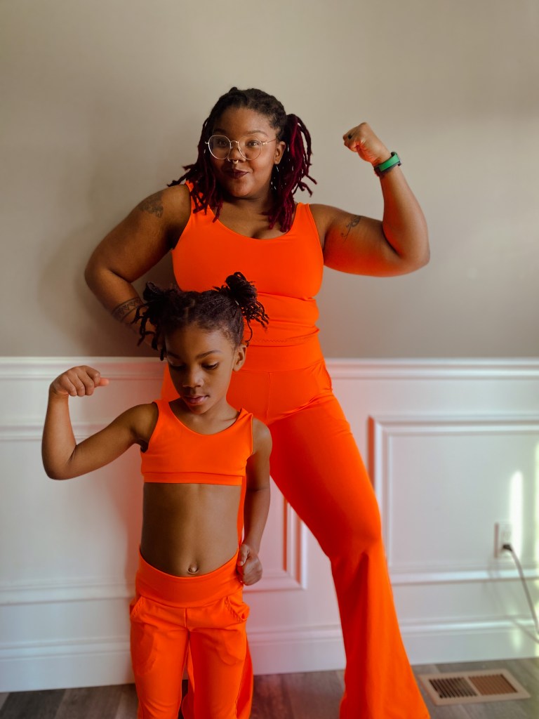 My second set is fabric from Amelia Lane Designs that is newly released. This is DBP and so soft on the skin! My only critique is my own mistake as I shouldn’t have made these flares with this DBP. When I first started sewing years ago I realized that DBP as leggings were not my jam due to my high sitting booty. DBP leggings would always fall down in the back despite adjustments. This was the case here and the length was not as long as I would like because of lack of good vertical stretch. I would definitely buy this fabric again and make a dress or romper though!