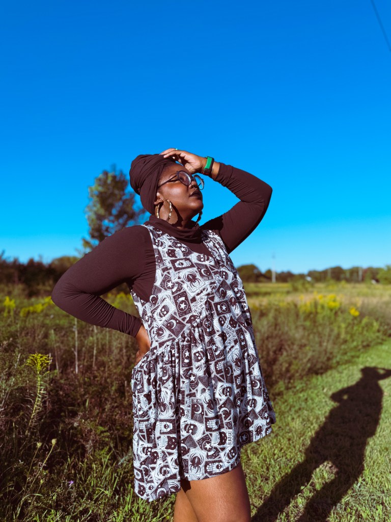 When I think of this pattern I have visuals of hippie aesthetics. I was inching really close to going all retro on y’all with this look! But I saw some gorgeous fabric from Joann and took it a different route. My thoughts were to give settle spooky vibes in my photos. My best friend Bridgette, also made this pattern and mentioned using her Extra Top to pair with the Sunray for a cute Fall look. Once I saw this idea in my head I could not pass this up. From there, we decided to “twin”. She is using a Nightmare Before Christmas print from our friends at Boho Fabrics. As mentioned previously, I used this tarot fabric from Joann. I had a black Extra top with a big cowl in my wardrobe already so no need to make another!